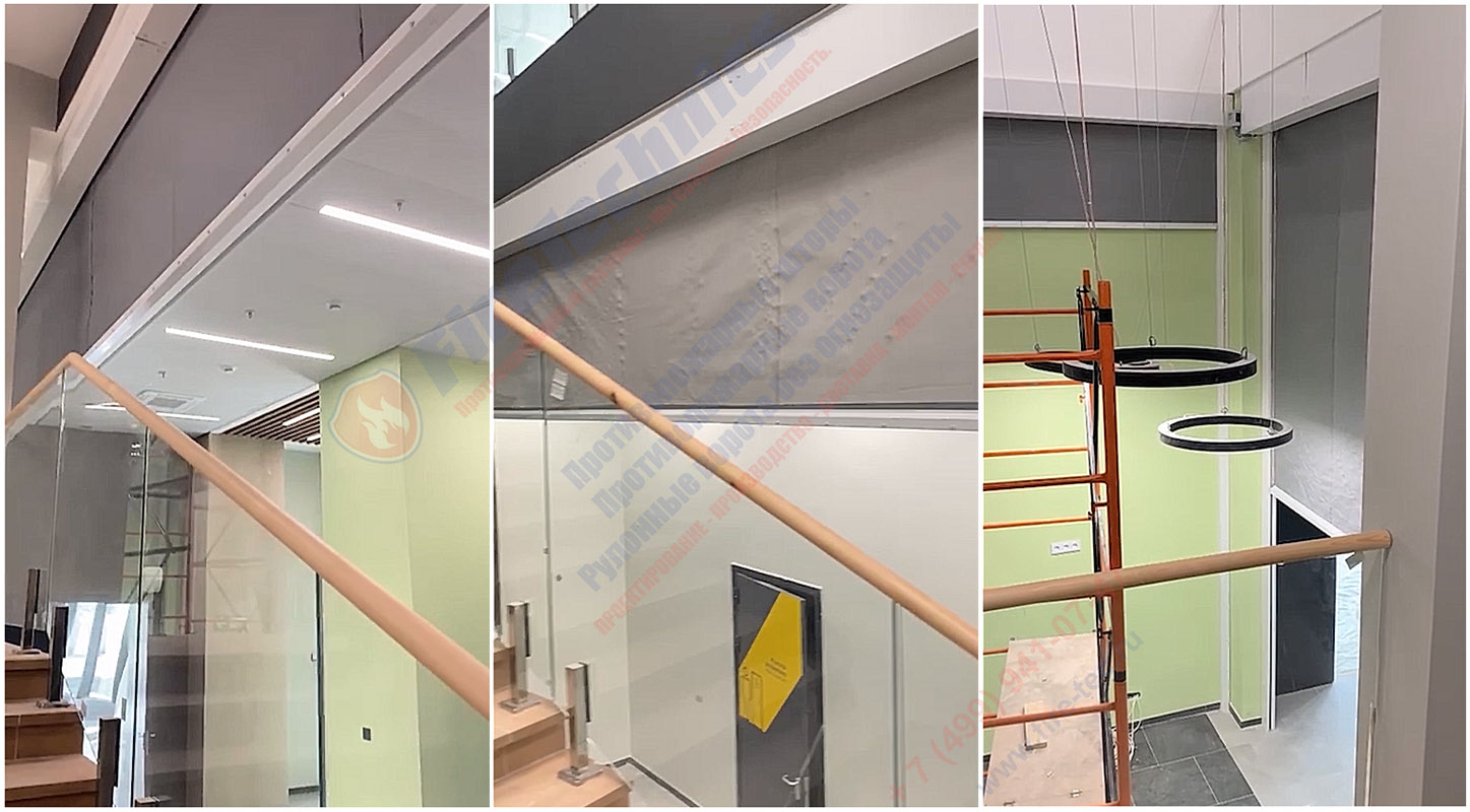 | Продукция с фирменным названием: | Штора (экран) противодымная торговой марки «FireTechnics», типа FireTechnics-E60 в рулонном исполнении, автоматическая, с полотном из негорючих материалов. Предел огнестойкости E60 |